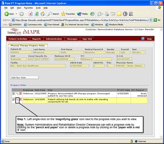 System Administrators and Rehabilitation Director Clearances can edit a progress note by clicking on the ‘pencil and paper’ icon or delete a progress note by clicking on the ‘paper and red X’ icon.