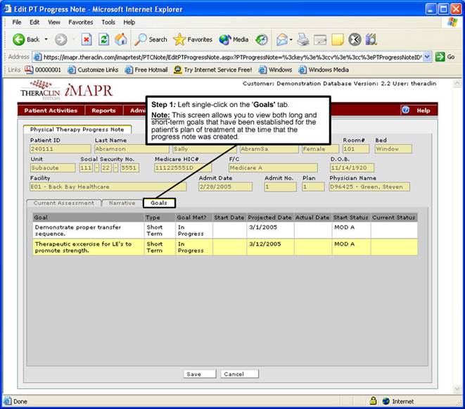 This screen allows you to view both long and short-term goals that have been established for the patient’s plan of treatment at the time that the progress note was created.
