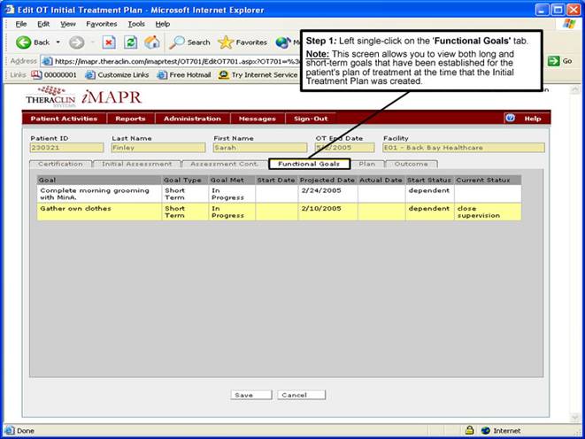 This screen allows you to view both long and short-term goals that have been established for the patient’s plan of treatment at the time that the Initial Treatment Plan was created.