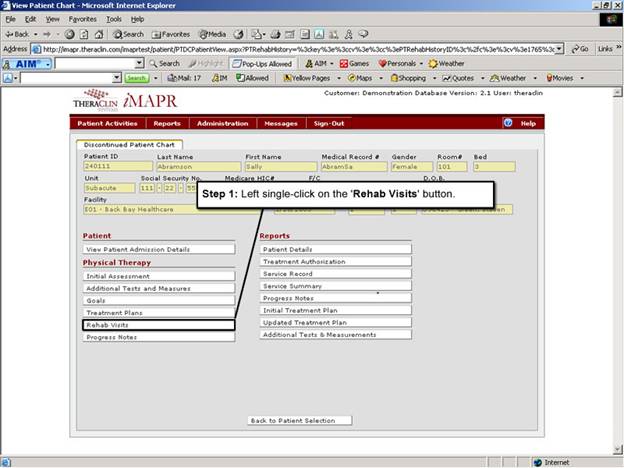 1. Left single-click on the ‘Rehab Visits’ button located on the Physical Therapy Discontinued Patient Chart menu.