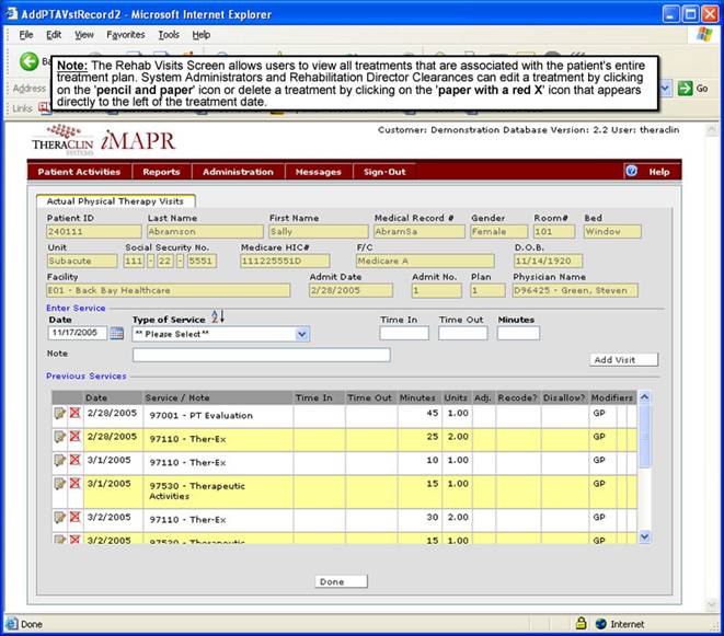 The Rehab Visits Screen allows users to view all treatments that are associated with the patient’s entire treatment plan. System Administrator and Rehabilitation Director Clearances can edit a treatment by clicking on the ‘pencil and paper’ icon or delete a treatment by clicking on the ‘paper with the red X’ icon that appears directly to the left of the treatment date.