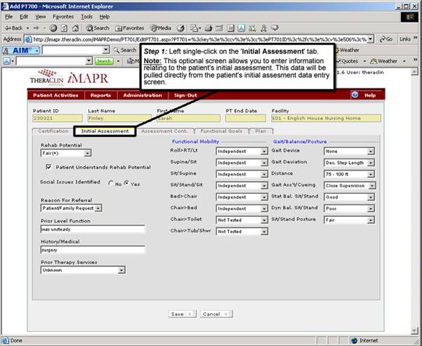 Note to Users: The information in this screen will be pulled from the initial assessment data entry screens. If there was no assessment information previously entered, the screen will not contain any information.