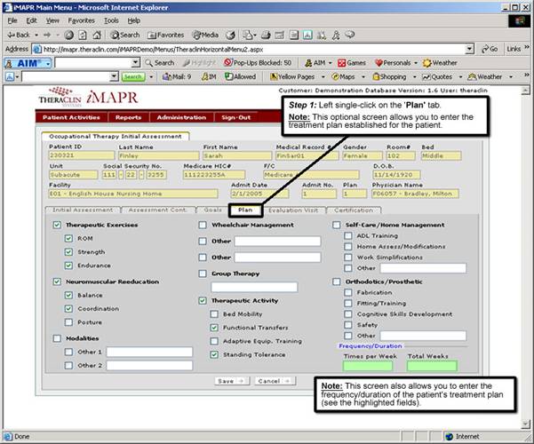1. Left single-click on the ‘Plan' tab and enter any information relating to the patient’s plan of treatment along with the frequency and duration of the plan. It is important to note that the information entered in this screen is optional.