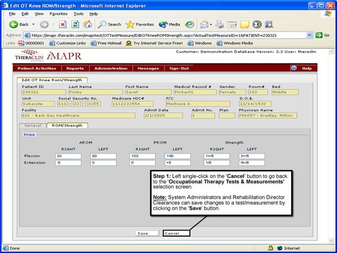 1. Left single-click on the ‘Cancel' button to go back to the ‘Occupational Therapy Tests & Measurements’ selection screen.