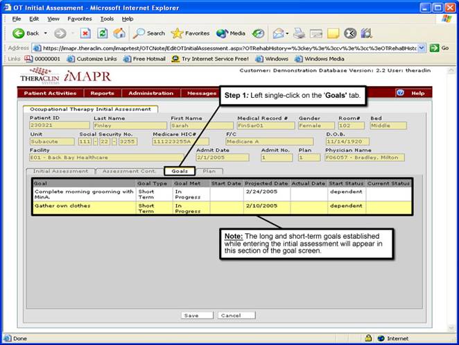The long and short-term goals established while entering the initial assessment will appear on the lower-half section of the goal screen.