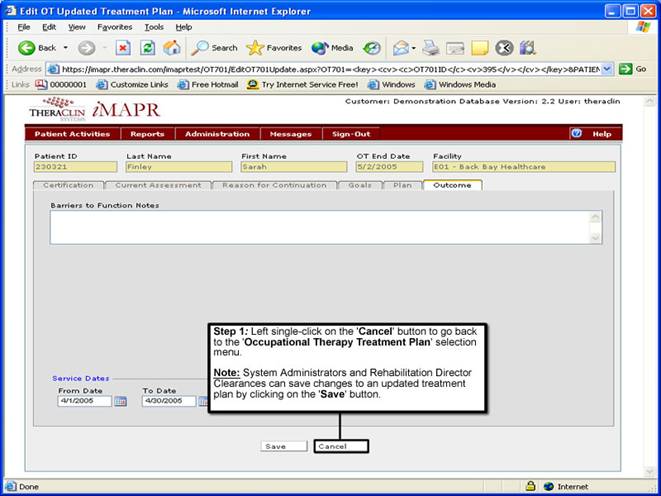 1. Left single-click on the ‘Cancel’ button to go back to the ‘Occupational Therapy Treatment Plans’ selection screen.