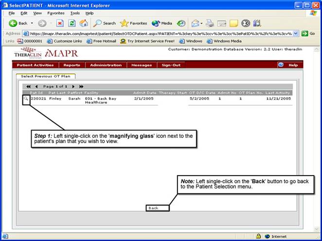 Left single-click on the ‘Back’ button to go back to the ‘Patient Selection’ menu.